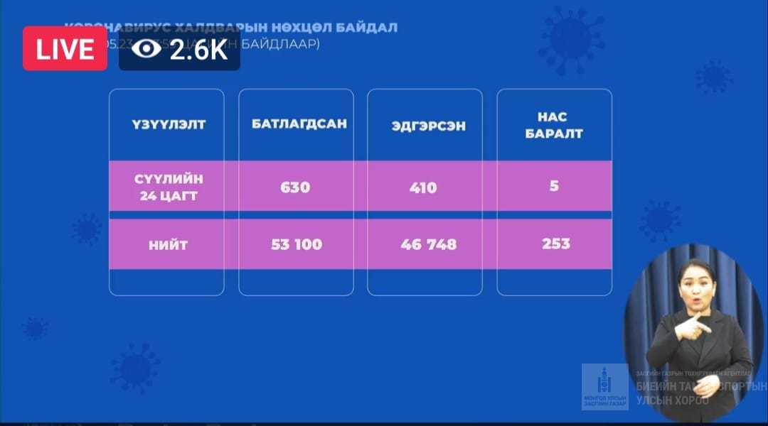 2021.05.24 Сүүлийн 24 цагт 630 шинэ тохиолдол бүртгэгдэж 410 хүн эдгэрч 5 нас баралт нэмэгдлээ. Та бид хайртай гэр бүлийнхээ төлөө гэртээ байж гадуур гарахгүй байх гараа угааж маскаа зүүхийг уриалж байна.