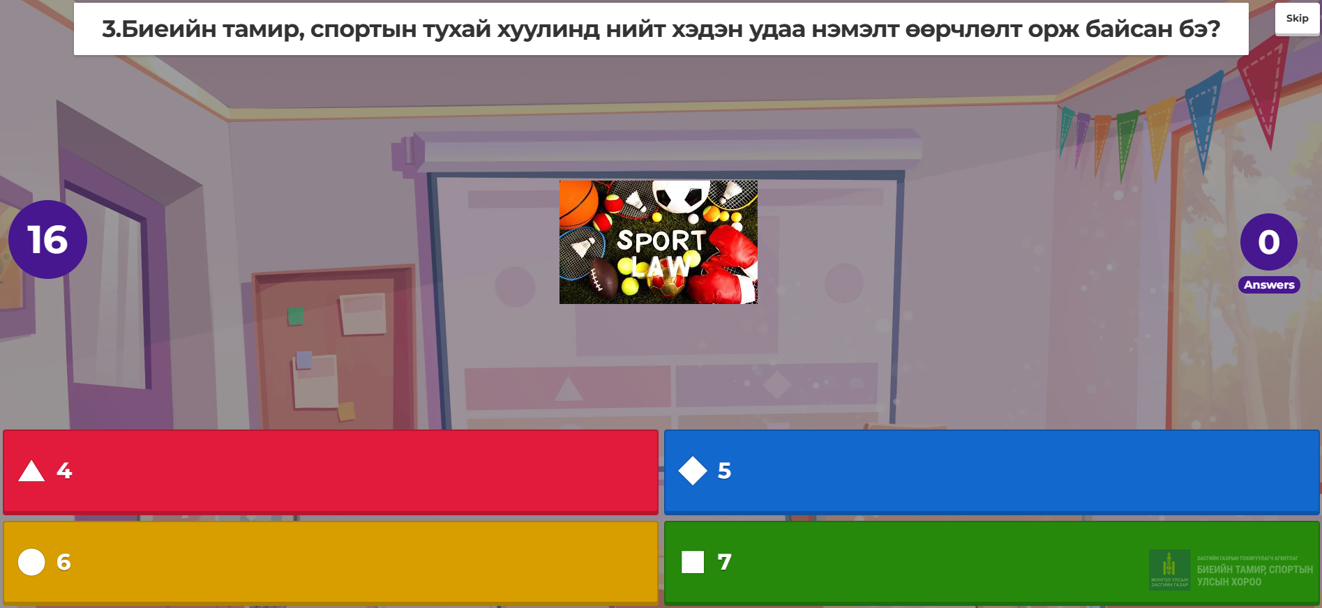 Хуулийн танилцуулга хийгдэж дууссаны дараагаар оролцогчдыг ямар түвшинд ойлголт авсаныг бататгаж Kahoot.it сайтыг ашиглан 15 тест бүхий асуулт хариултын тэмцээн явуулж эхний 3 байранд шалгарсан оролцогчдыг ном, шатар, дурсгалын зүйлээр шагнан урамшуулав.